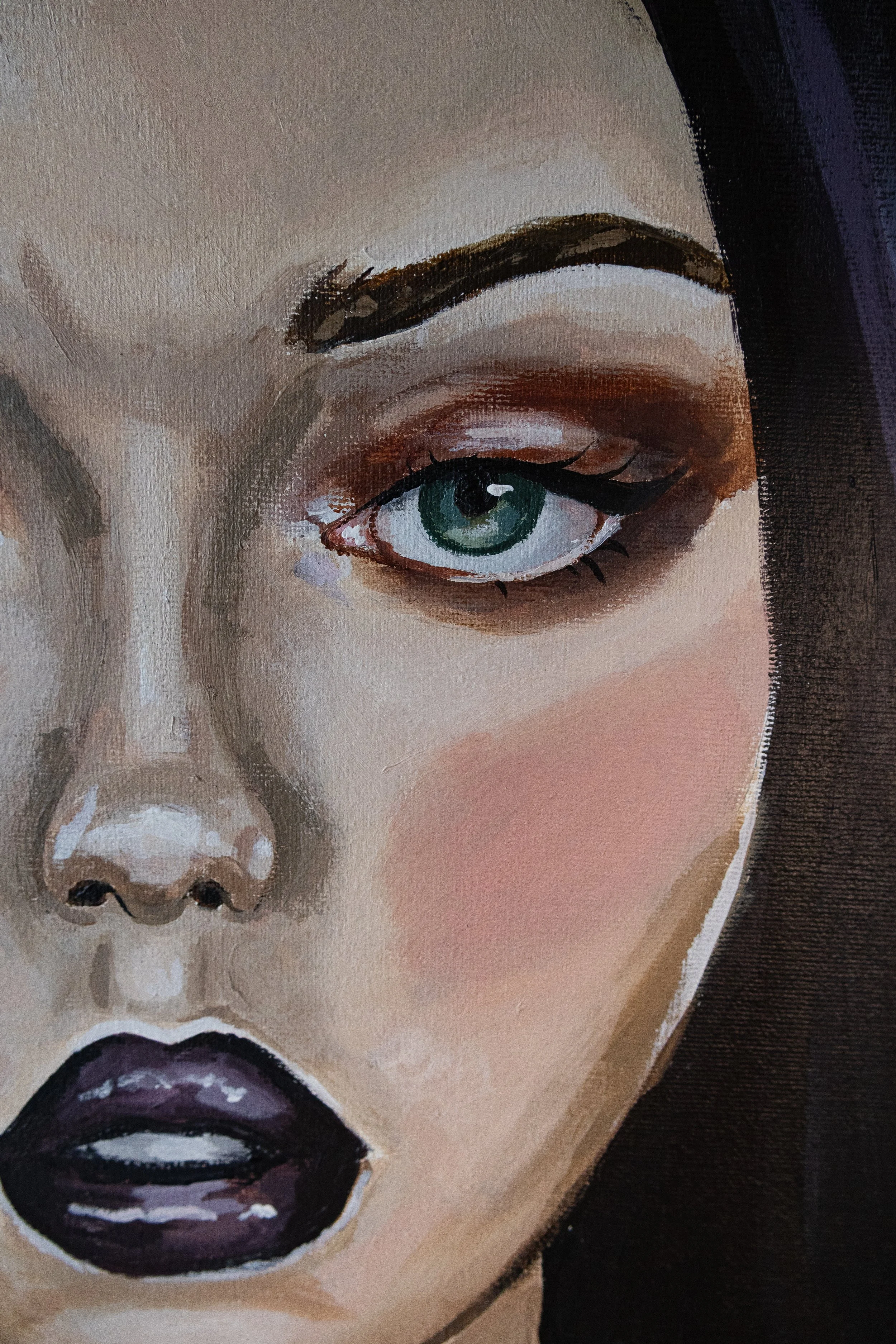 Die reduzierte Farbpalette und bewusst gesetzte Kontraste verleihen dem Porträt eine ruhige, zugleich kraftvolle Präsenz. In der Darstellung verbinde ich realistische Elemente mit einer stilisierten, zeitgenössischen Interpretation, die eine offene, nicht eindeutig festgelegte erzählerische Ebene entstehen lässt.