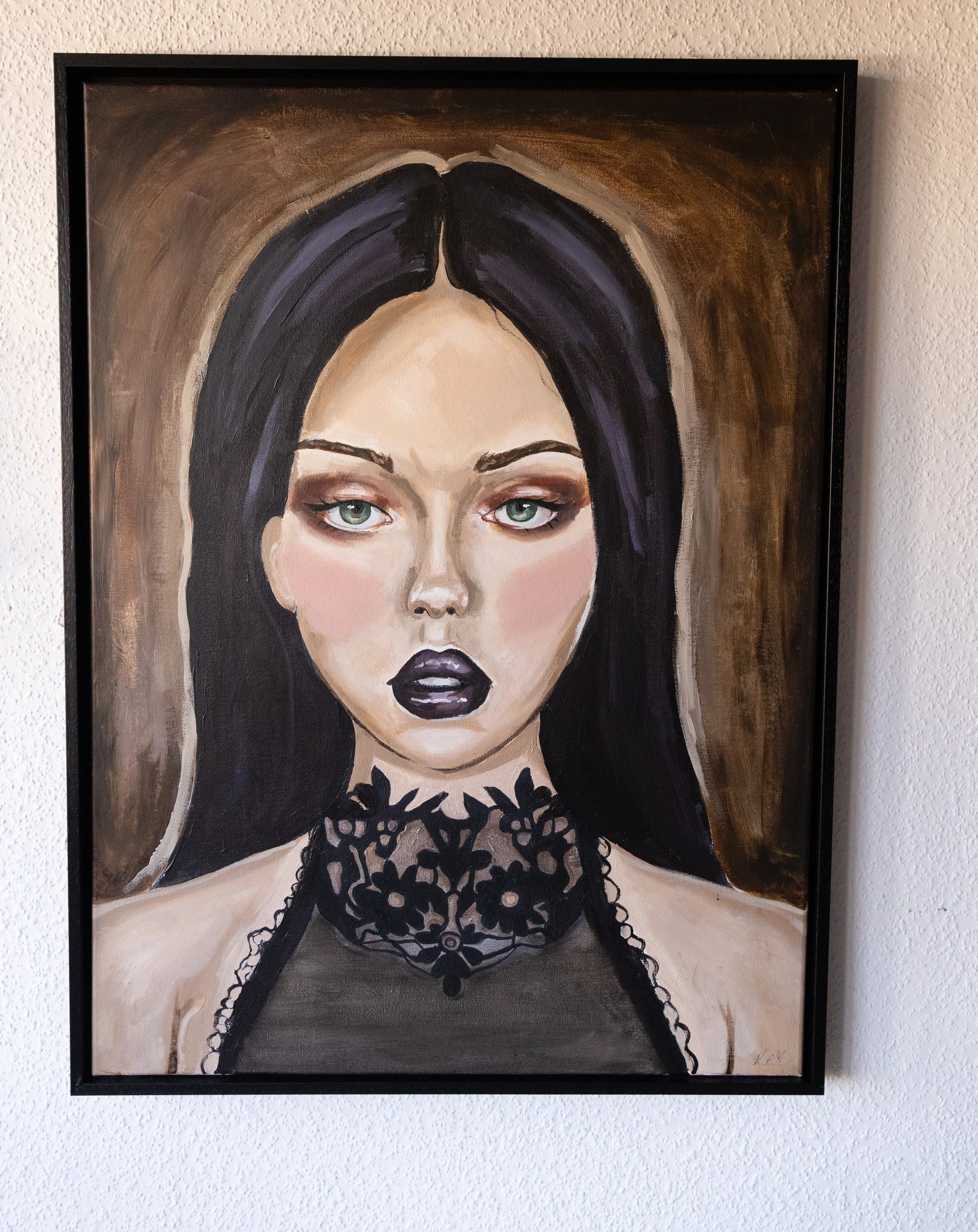 Dieses Werk ist ein freies Acrylgemälde und Teil meiner bildnerischen Auseinandersetzung mit weiblichen Figuren und atmosphärischer Bildsprache. Dargestellt ist eine junge Frau mit dunklem Haar und einem klaren, markanten Blick, eingebettet in einen tiefbraunen Bildraum mit dezent schimmernden Akzenten.